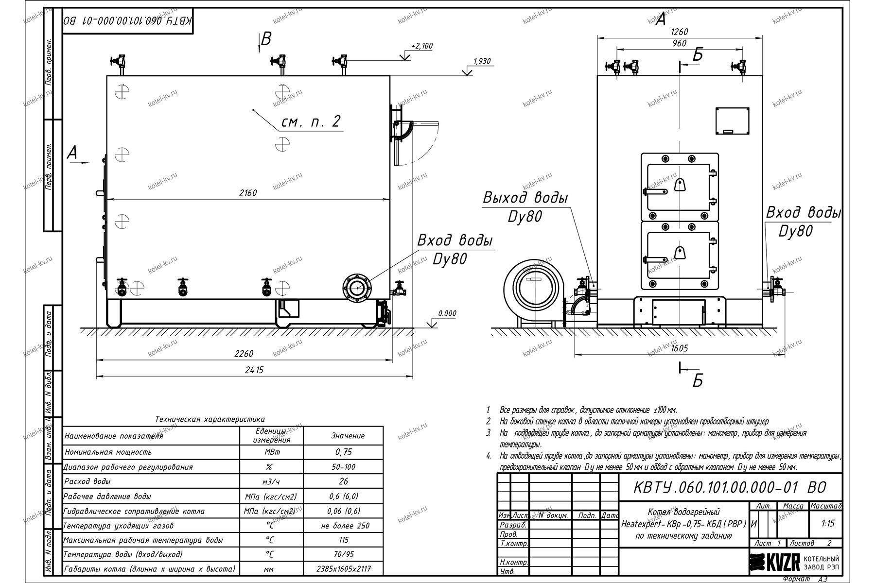 Завод производитель в г Екатеринбург в процессе производства и технического контроля подвергает промышленный КВр-0,75 К с колосниками гидравлическому испытанию давлением 0,9 МПа (9 кгс/см2).
